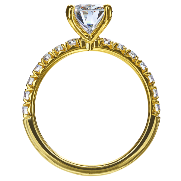 This 18 karat yellow gold engagement ring is fishtail pave set with 14 round brilliant cut diamonds weighing 0.48 carats total. Also available in platinum, 18 karat white, or rose gold. Suggested retail price does not include center diamond and may vary according to customization.