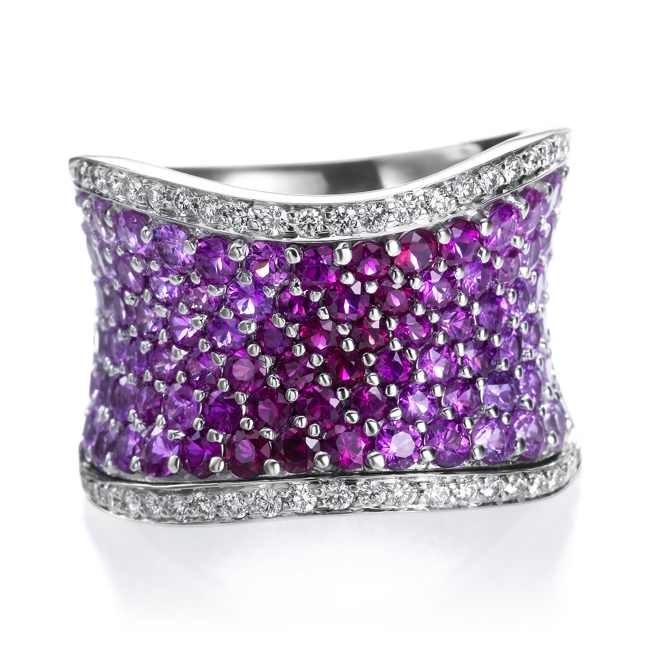 18 karat white gold “Intensity” ring with diamonds, pink sapphires, and rubies.