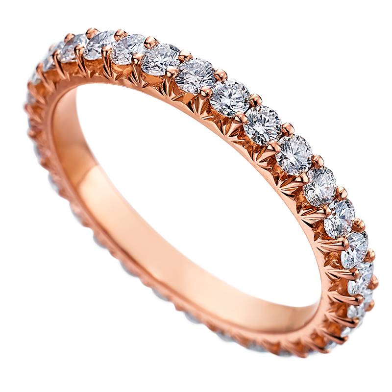 This timeless Royal Prong band has 30 round brilliant cut diamonds weighing 1.00 carats total set in 18 karat rose gold. It has delicate hand engraving on the prongs and is perfect for stacking, wearing with your engagement ring or simply on it’s own. Also available in platinum, 18 karat white or yellow gold.